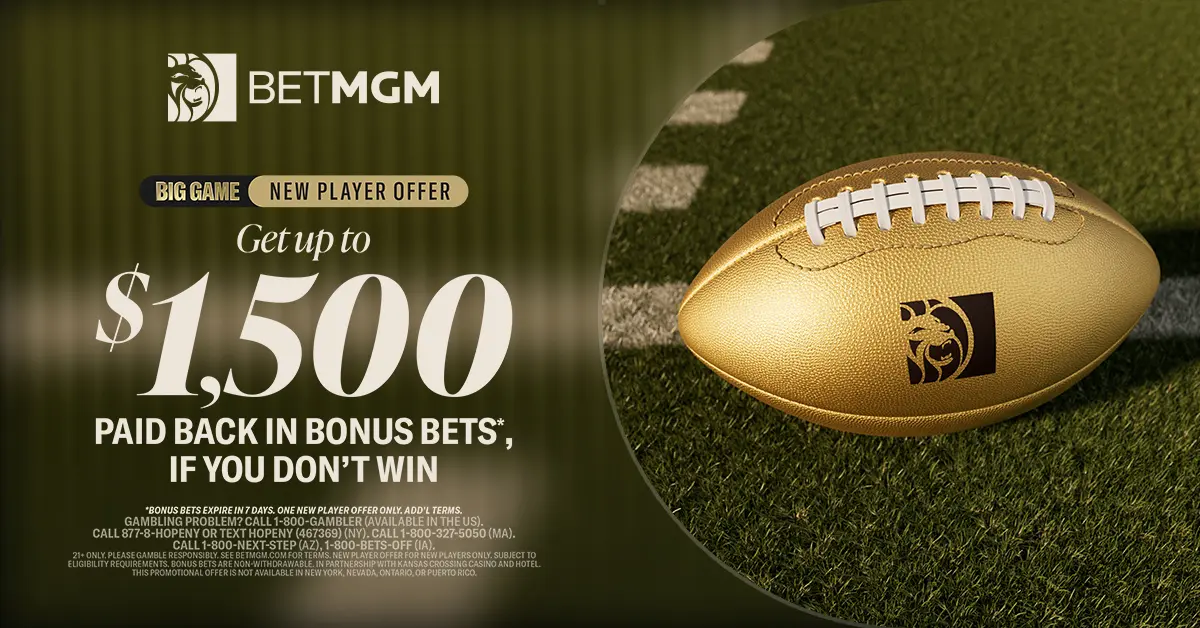 Min. first deposit of $10. Subject to eligibility requirements. Rewards are non-withdrawable bonus bets that expire in 7 days. Bonus bets amount equals lost stake up to $1500. Must be physically located in NC, NJ, IN, WV, DC, CO, PA, MI, IA, AZ, LA, TN, IL, VA, MD, MS, WY, MA, KS, OH, or KY. Void where prohibited. In partnership with Kansas Crossing Casino and Hotel. See BetMGM.com for Terms. US promotional offers not available in Mississippi, New York, Nevada, Ontario, or Puerto Rico.